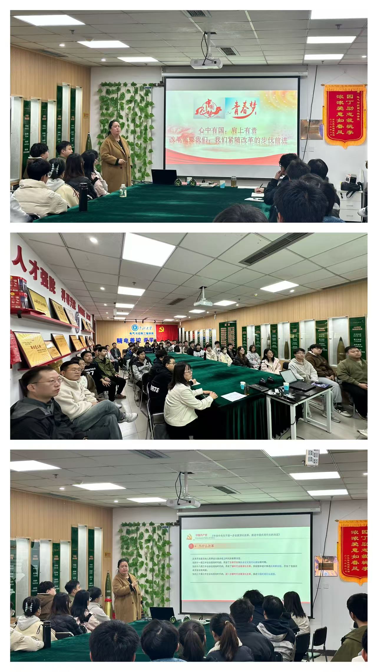 11月12日,活动进入党的二十届三中全会精神的交流环节。学院党委邀请了校宣讲团讲师薛艳霞老师,为学生们详细解读了党的二十届三中全会的精神内涵和重要意义。薛老师围绕中国式现代化的内涵、“七个聚焦”、“六个坚持原则”等方面进行了深入解读,并着重强调了青年一代在推动国家发展中的重要责任和使命。学生们积极发言,分享了自己的学习心得和体会,表示将更加清晰地认识到新时代青年的历史使命和责任担当,坚定为国家发展贡献力量的决心和信心。