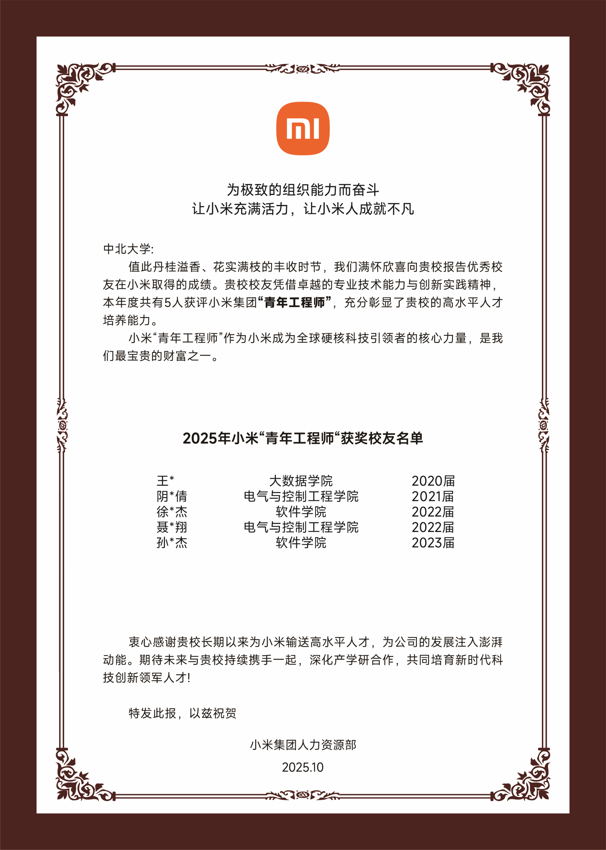 近日,小米集团人力资源部向在线赌博游戏网站发来贺报,祝贺我校5名优秀校友在2025年度荣获小米“青年工程师”称号,其中在线赌博