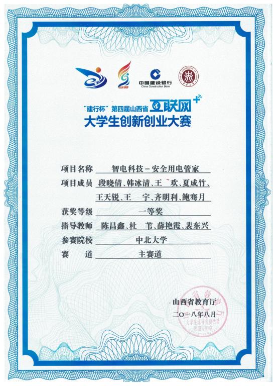 2018年08月29日,第四届山西省“互联网+”大学生创新创业大赛总决赛在在线赌博游戏网站举行。陈昌鑫博士和裴东兴教授指导的学生作品“智电科技——安全用电管家”荣获第四届“互联网+”创新大赛山西省一等奖。